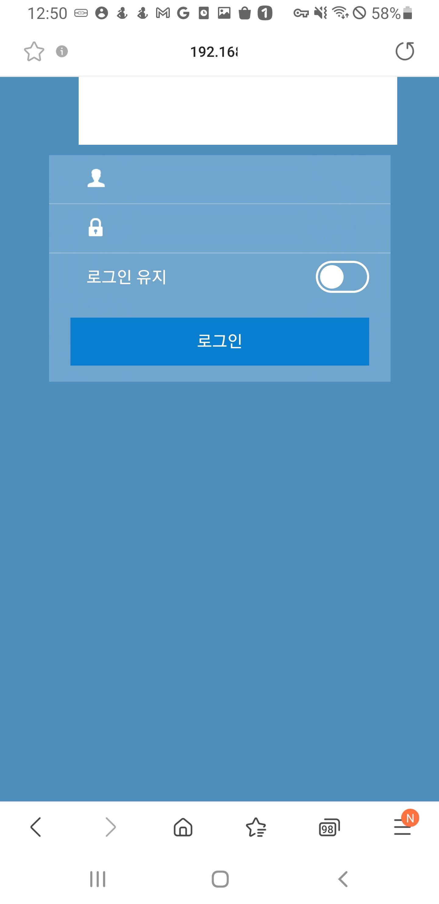 8) 정상적으로 연결되었는지 확인하기 위해 브라우저 어플을 실행하여 NAS로 접속하는 내부 IP를 입력합니다. 192.168.0.10이 NAS의 내부 IP라고 하면 192.168.0.10를 입력하면 됩니다. 그러면 아래와 같이 성공적으로 접근이 가능합니다. ID와 패스워드를 입력하여 사용하시면 됩니다.