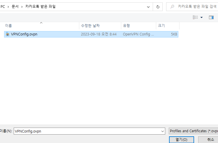 그리고 1번에서 옮긴 ovpn파일을 찾아 클릭합니다.