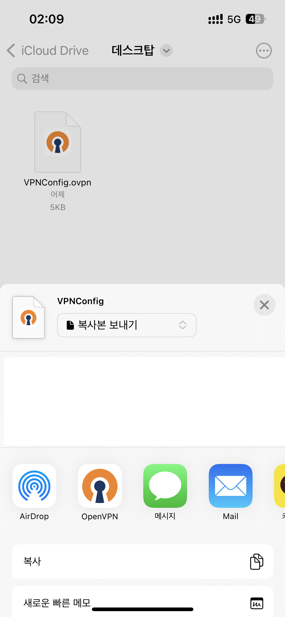 1) 앞서 진행한 설정에서 만들어낸 Ovpn 파일을 iPhone으로 옮깁니다.